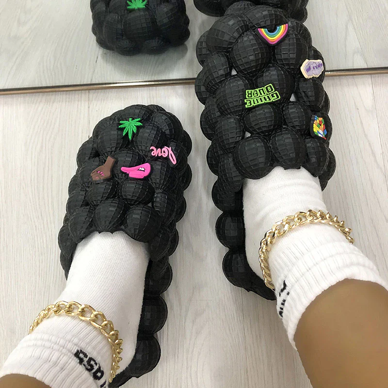 High-grade Material: These INDOOR® Non-Slip Unisex Richy Puffs Ball Slippers Bubble Cushion Slippers are made of soft and healthy EVA, providing a comfortable and relaxing foot experience, breathable, lightweight, simple, and stylish. The particularity of the material makes it a bit difficult to wear at the beginning. As time goes by, the softer it crosses. The toe cap is upturned so that the foot is not tired when walking.